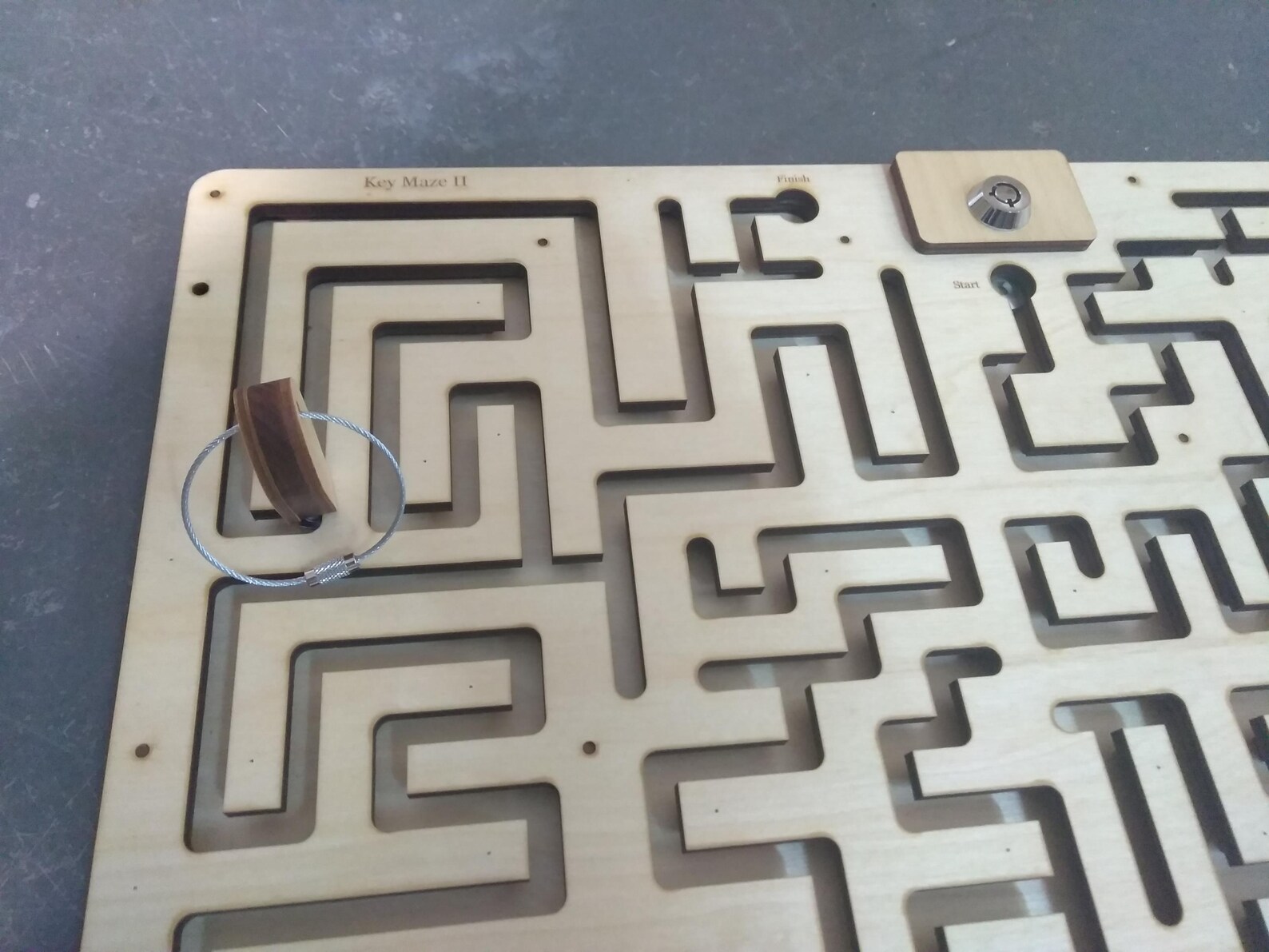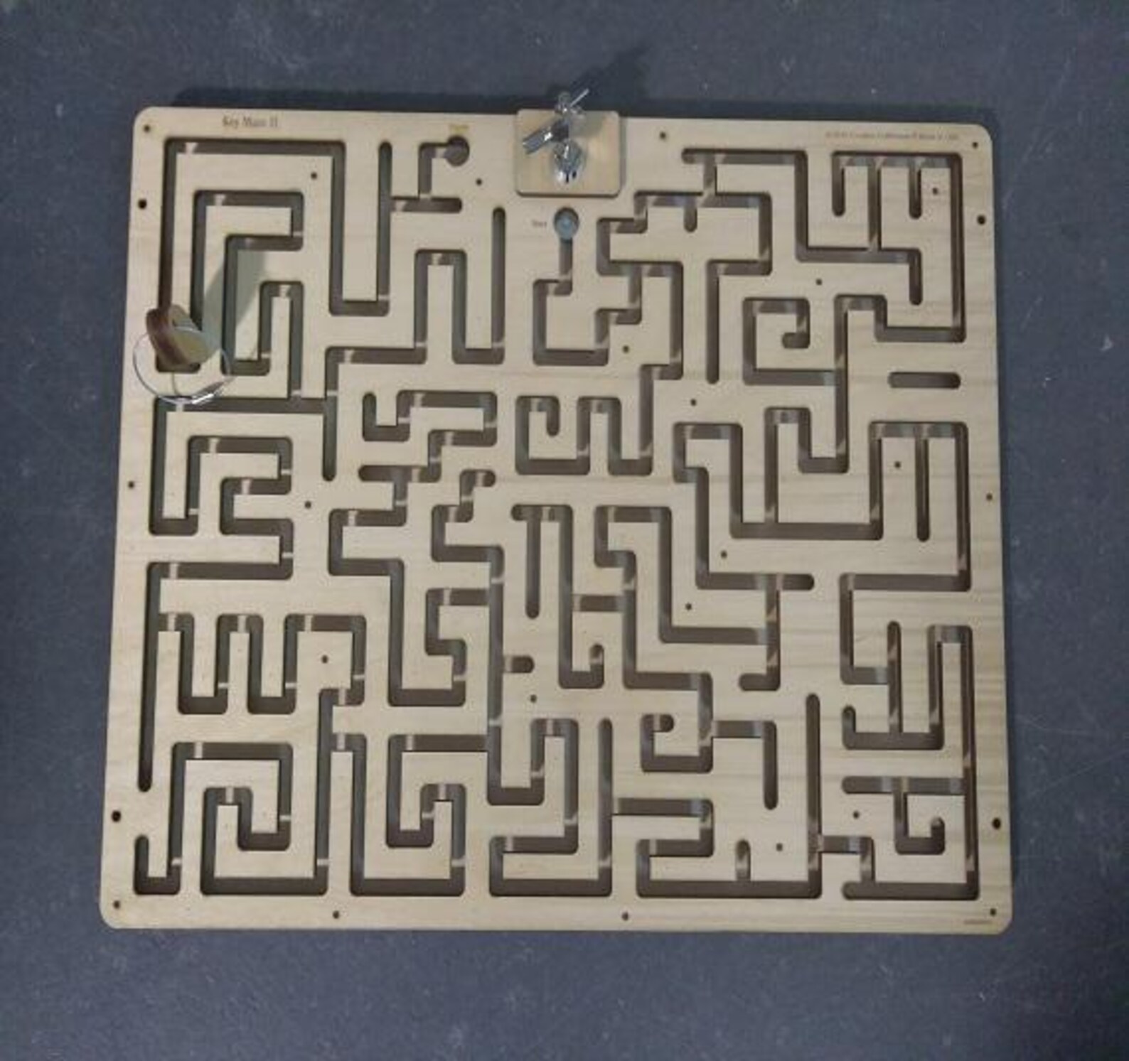 This puzzle will trap a key or any object that can be inserted on a wire key chain (such as a ring or tool with a small hole). To retrieve the key you must solve the maze and guide the rod along the correct path to the Finish hole. This was designed with Escape Rooms in mind.