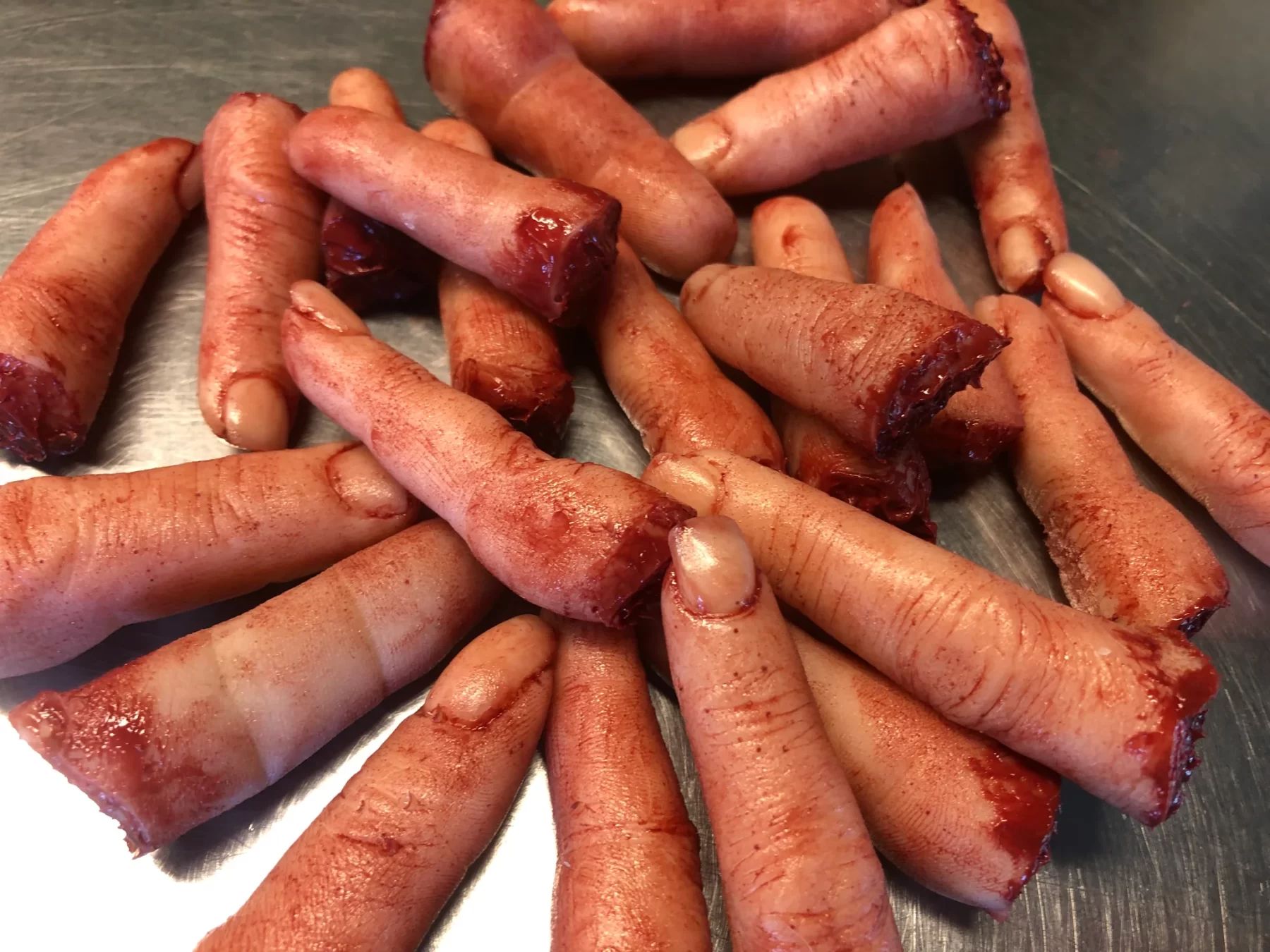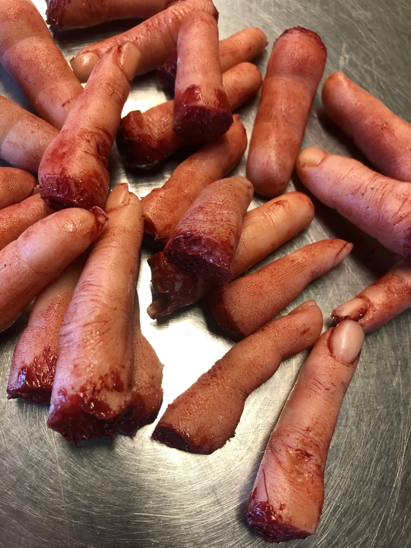 This is a lot of 20 severed fingers made of silicone and of various sizes and skin tones.