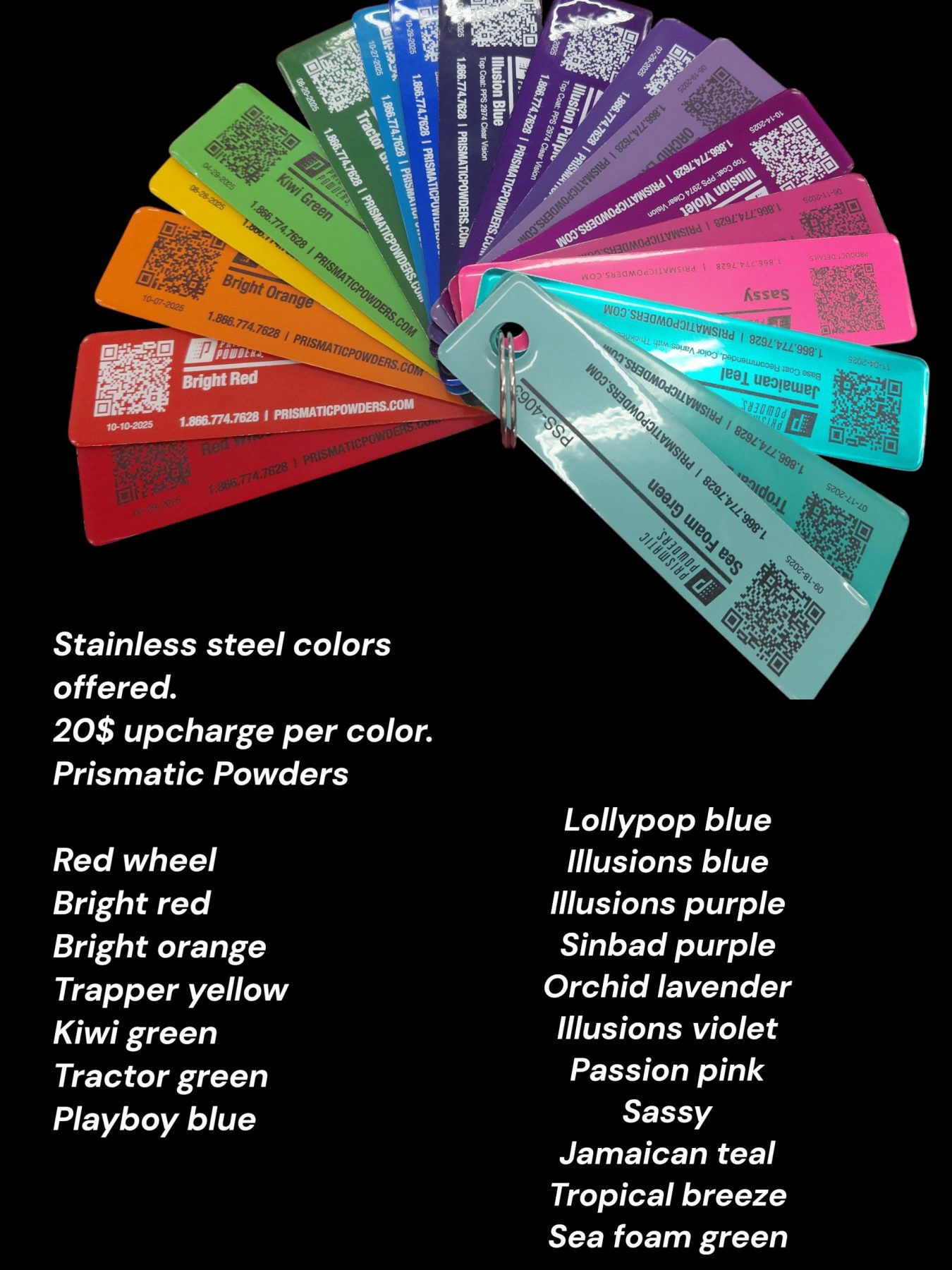Please note the colored stainless steel is hand coated and is a 20$ up charge per color.