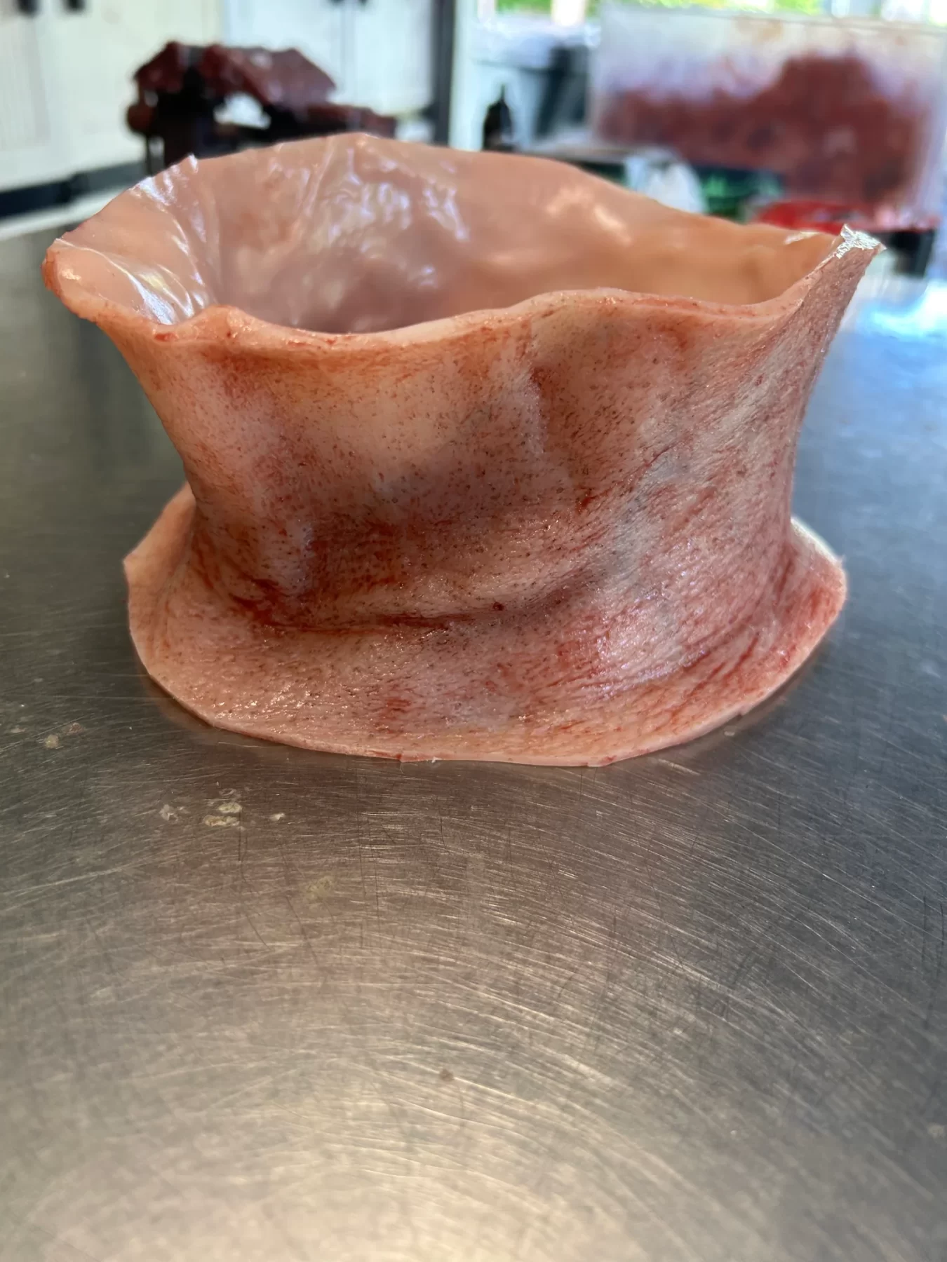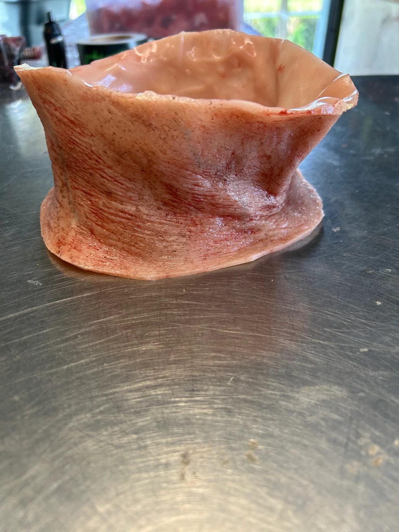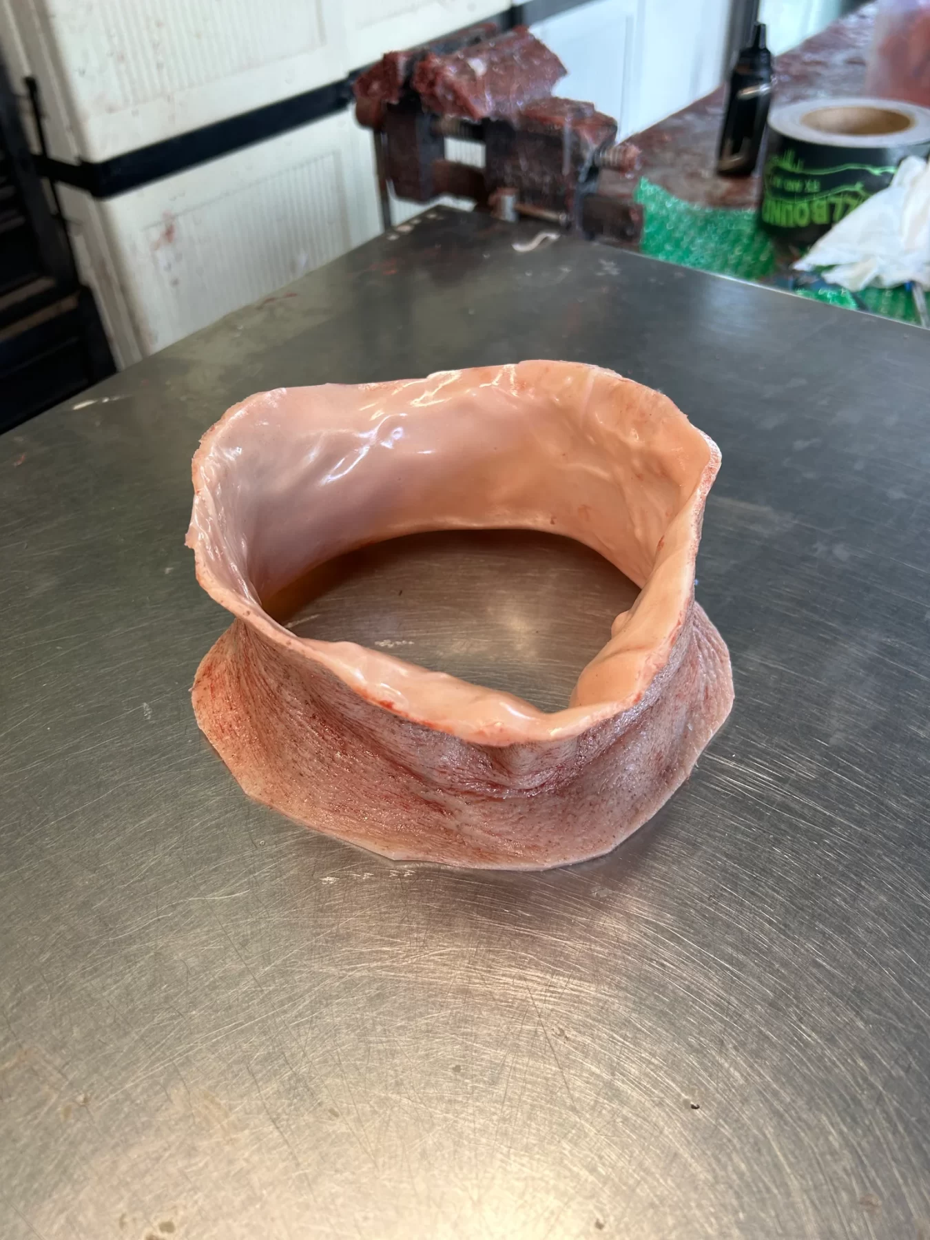 This piece is made of silicone and was life casted. The perfect addition to your static prop where the annoying mannequin neck is exposed. Durable and elastic simply pull over the neck of your mannequin.