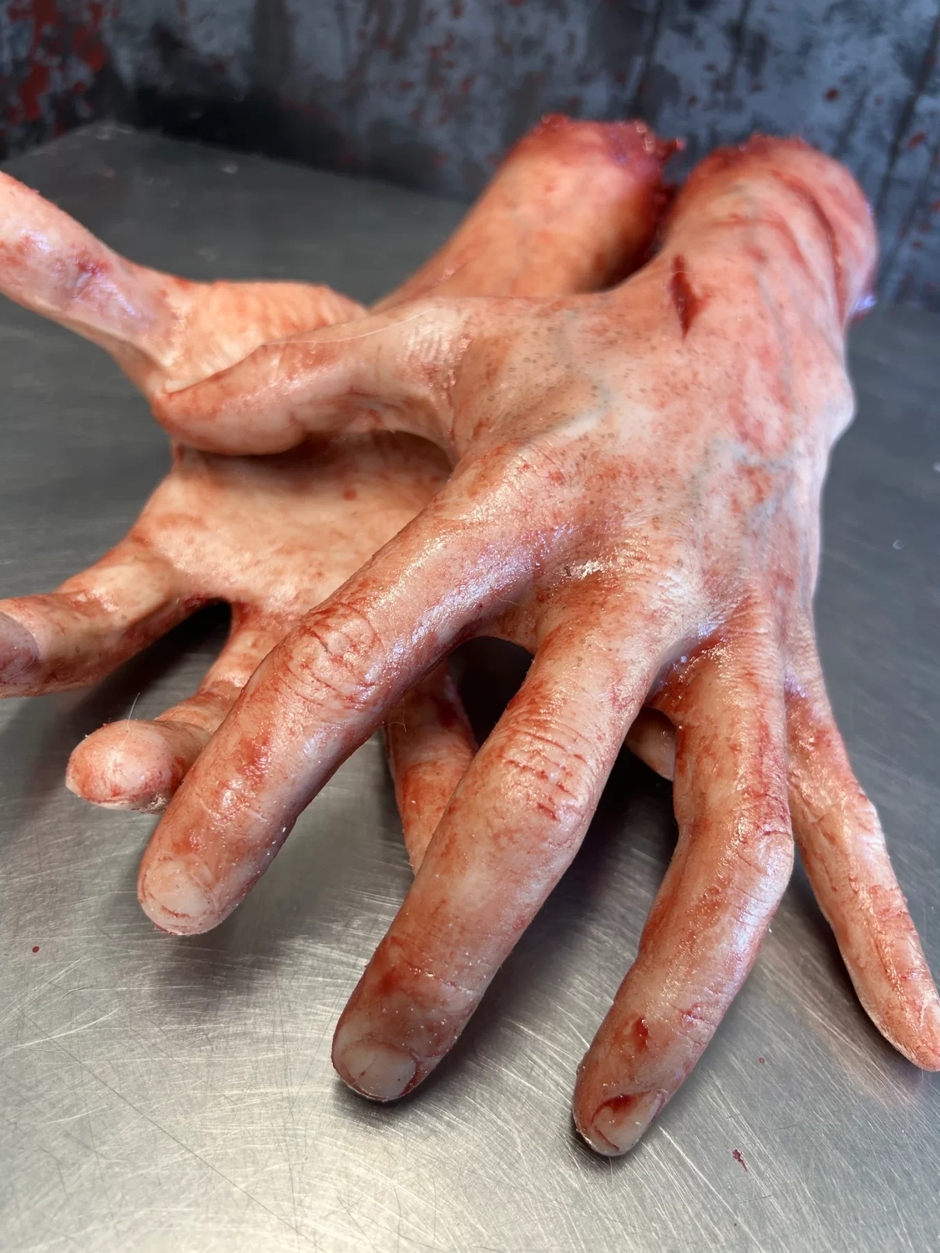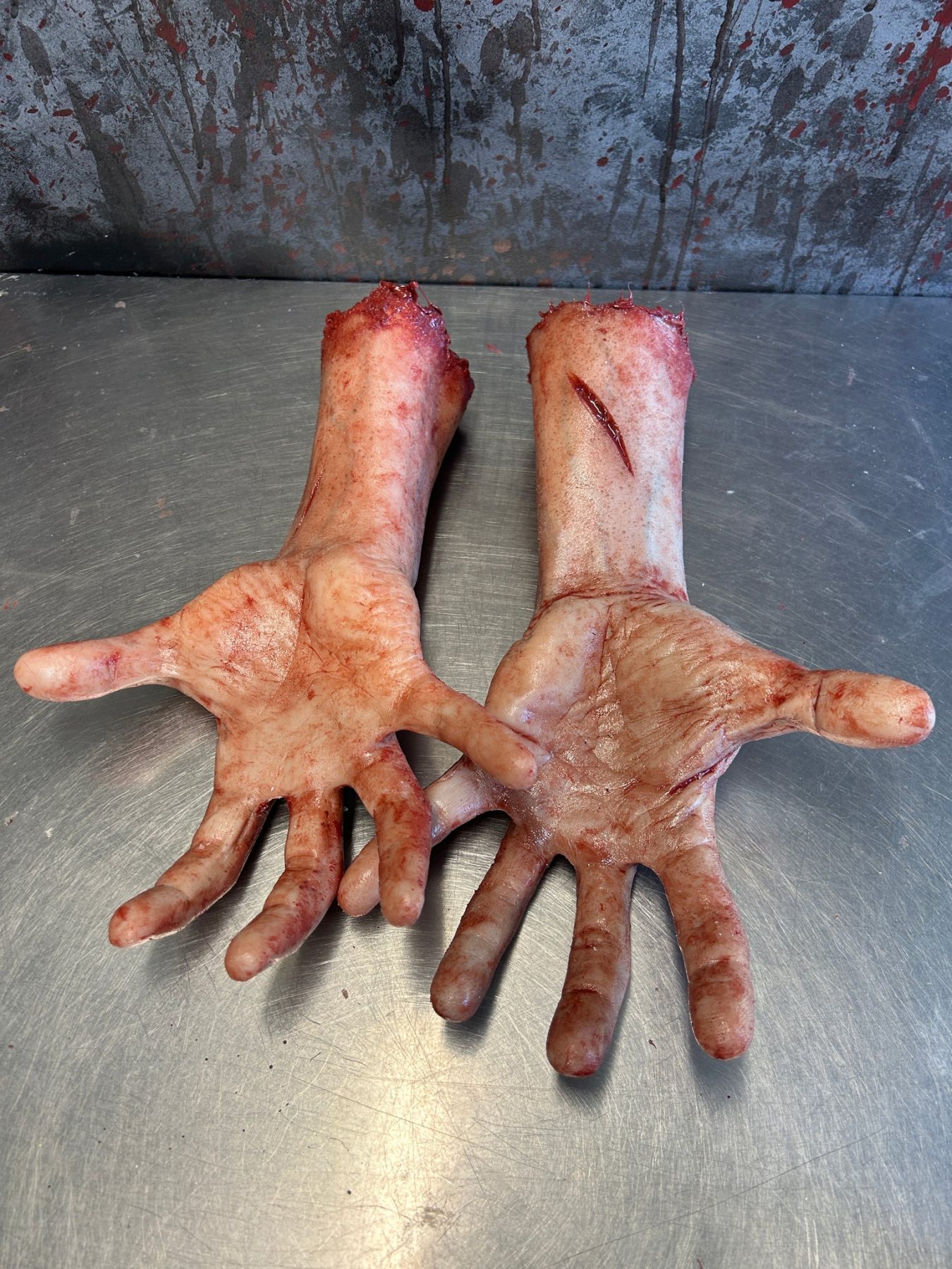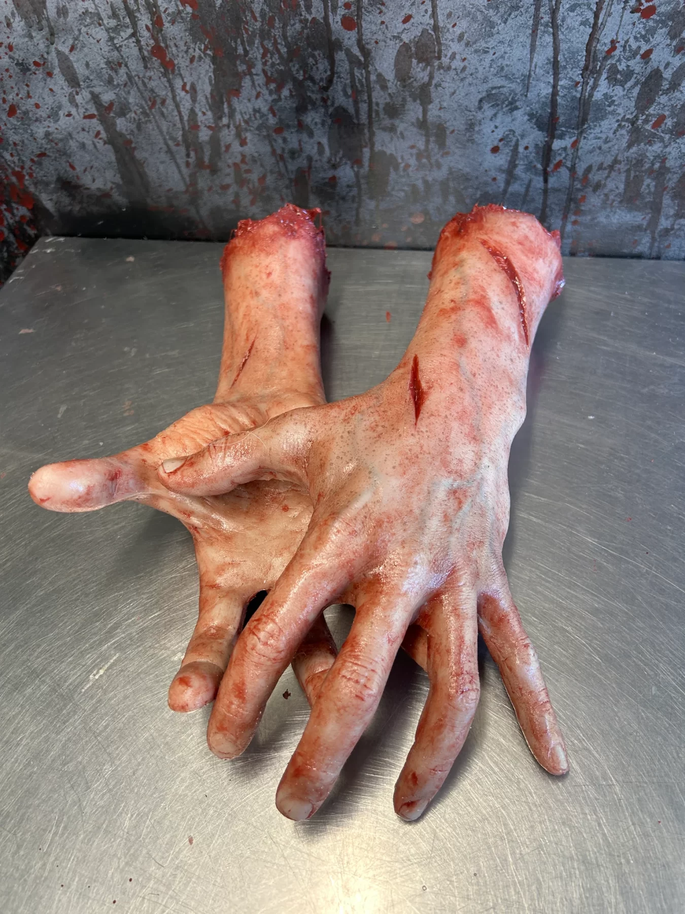 This pair of male hands is highly detailed and film ready. Solid silicone hands and wrist with a foam core in the forearm area. PVC piping optional for your mounting needs. All hands are individually painted to ensure a one of a kind piece.