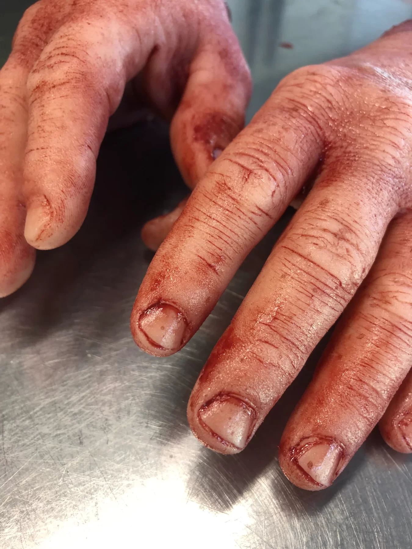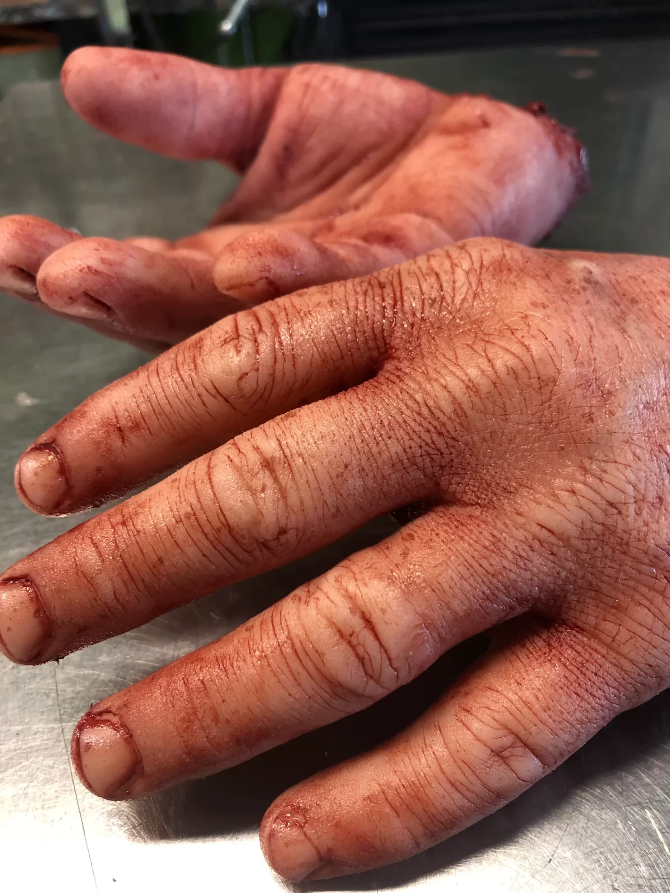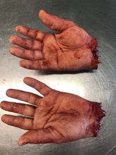 These hands are solid silicone and are highly detailed the perfect addition to your haunt or film set. Each pair are made to order so scaring and blood splatter may vary.