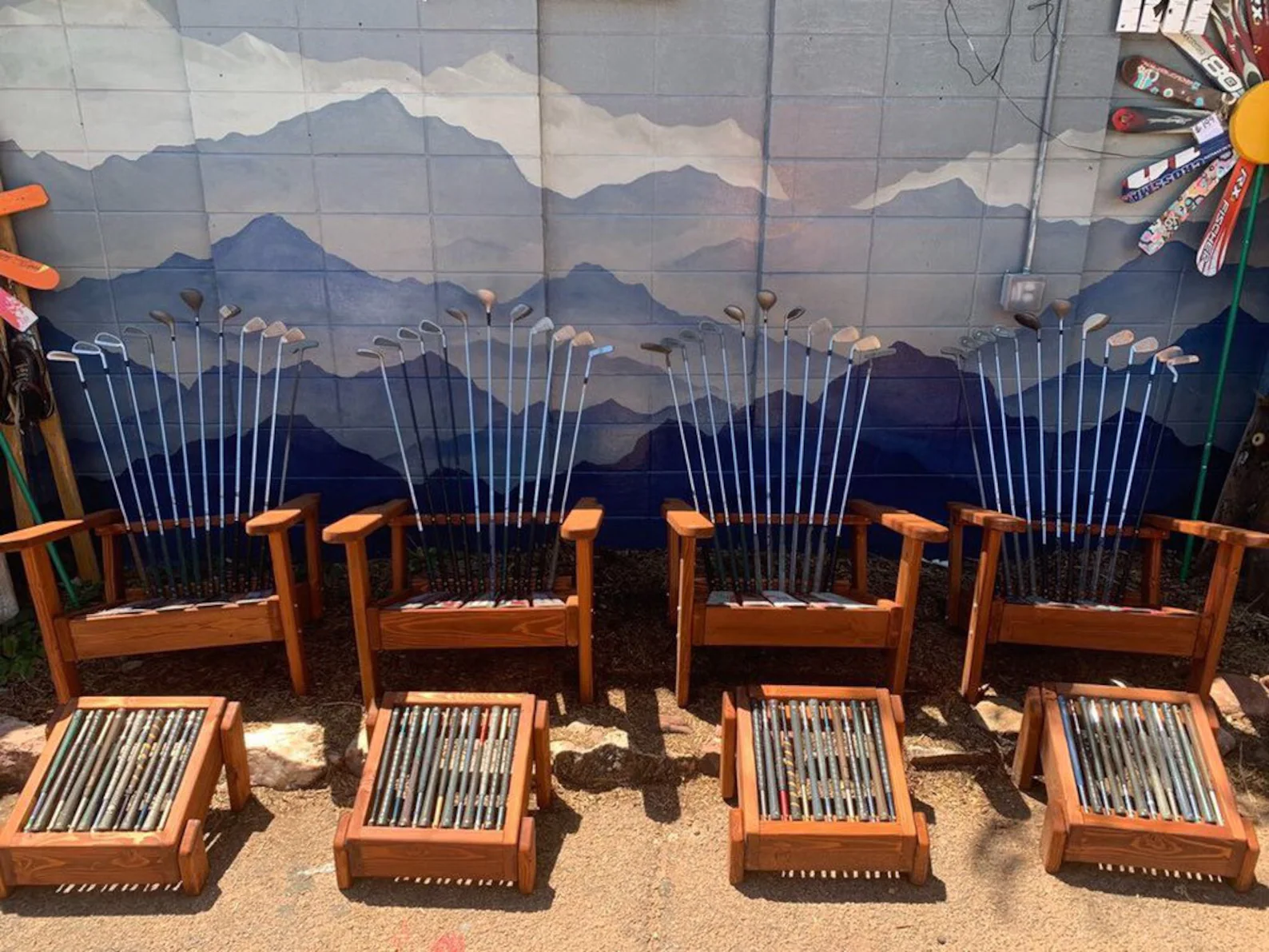 These 2 beautiful and genuinely comfortable adirondack chairs have golf club backs, skis for the seat boards, Douglas fir and mahogany frames and are built to last outdoors for years. Bundle with a matching ottoman today and get an amazing deal! Reach out and custom order your golf chairs today!