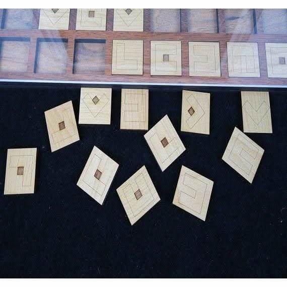 You are provided with a large base (22” x 7”) and set of wood laser engraved blocks.  The symbols on each block represent a letter of the alphabet.   We can set these up ahead of time to read the message of your choice or will provide you with the board and 44 blocks for you to establish your own message. The message can be reset within the limitations of the letters you have available to work with, but each symbol can generally represent multiple letters depending on how it is rotated so nearly any message could be created or you can change them over time.  There will be an acrylic cover held in place by 4 screws which will secure the letter blocks in place such that the cipher could be wall mounted if you chose or of course sit flat on a table.