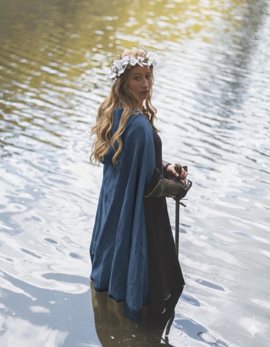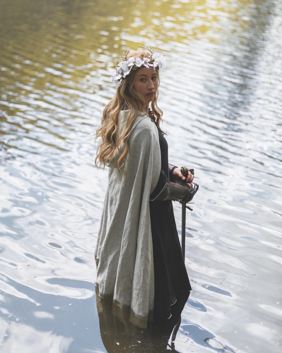 This linen cloak features a leather tie to secure it at the neck. We leave the bottom edge of the cloak slightly frayed for a more weathered and worn look, which also helps the fabric fall and flow nicely. Great for medieval, fantasy, or Lord of the Rings inspired cosplay, LARP, or stage and film productions.