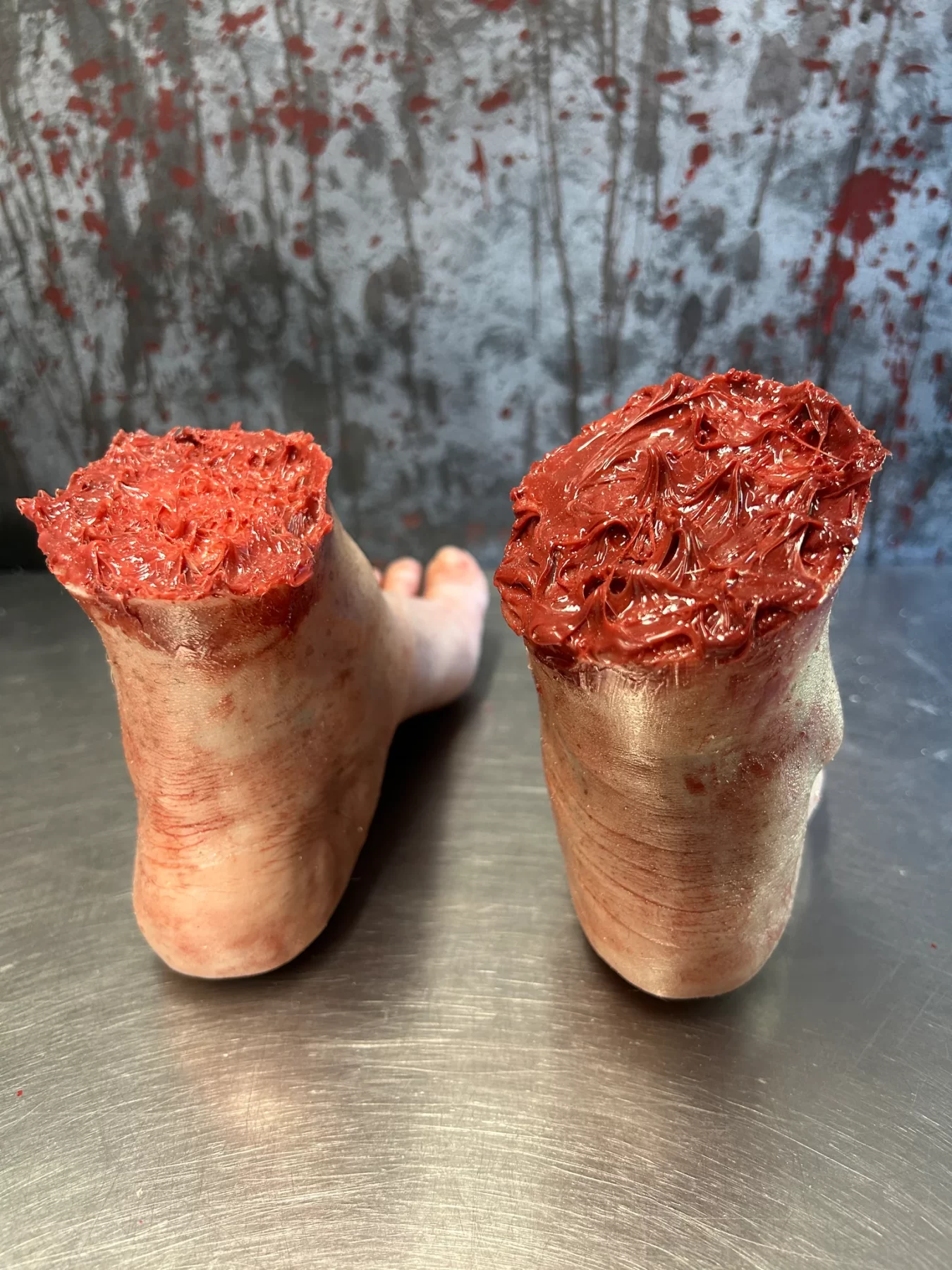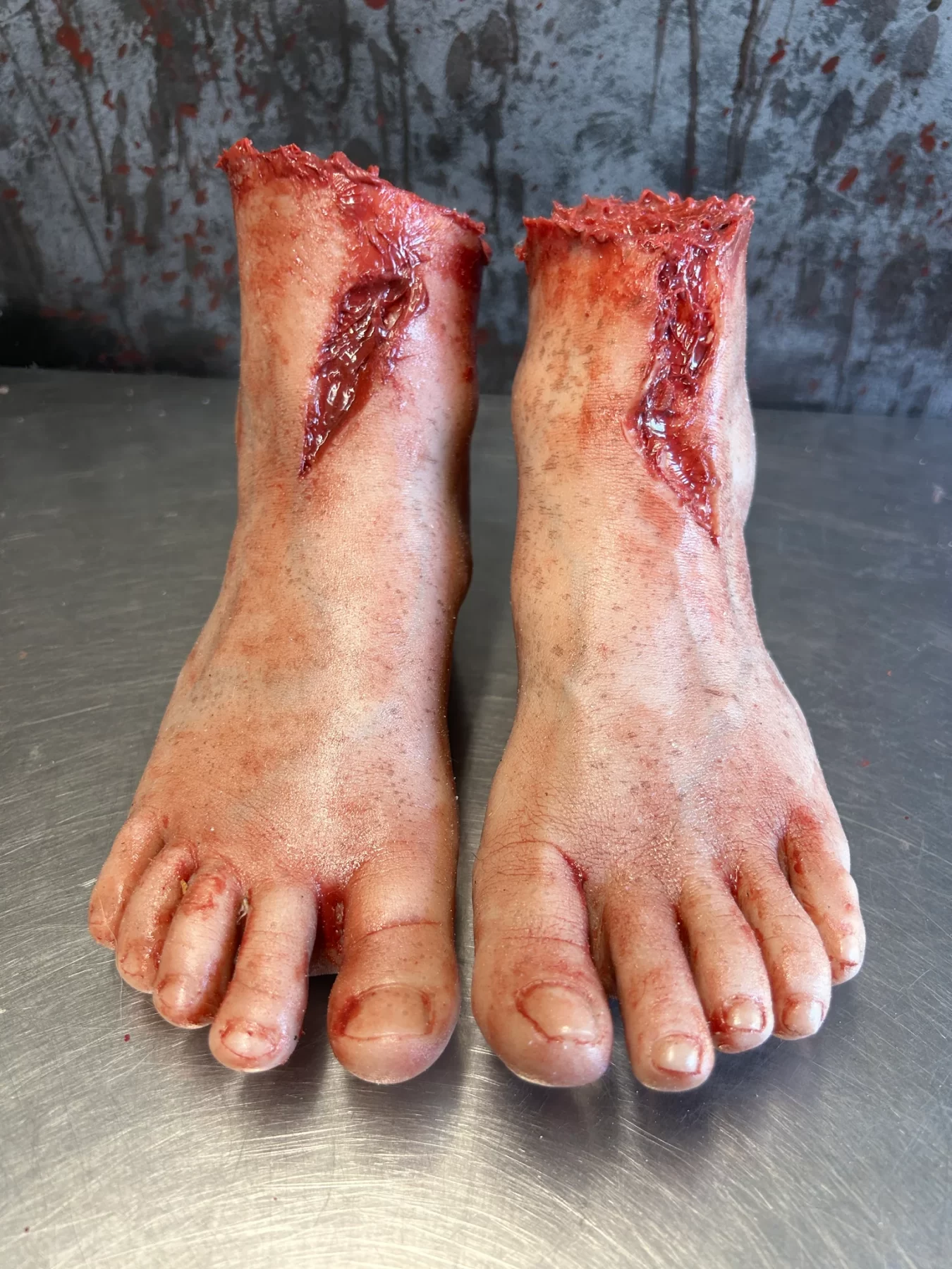 These feet are mostly solid silicone with a small foam core in the ankle. These items are individually made to ensure each pair is unique. Highly detailed these props are film ready. Allow 2 to 3 weeks for production.
