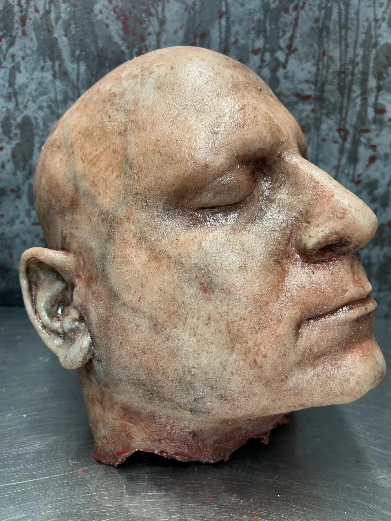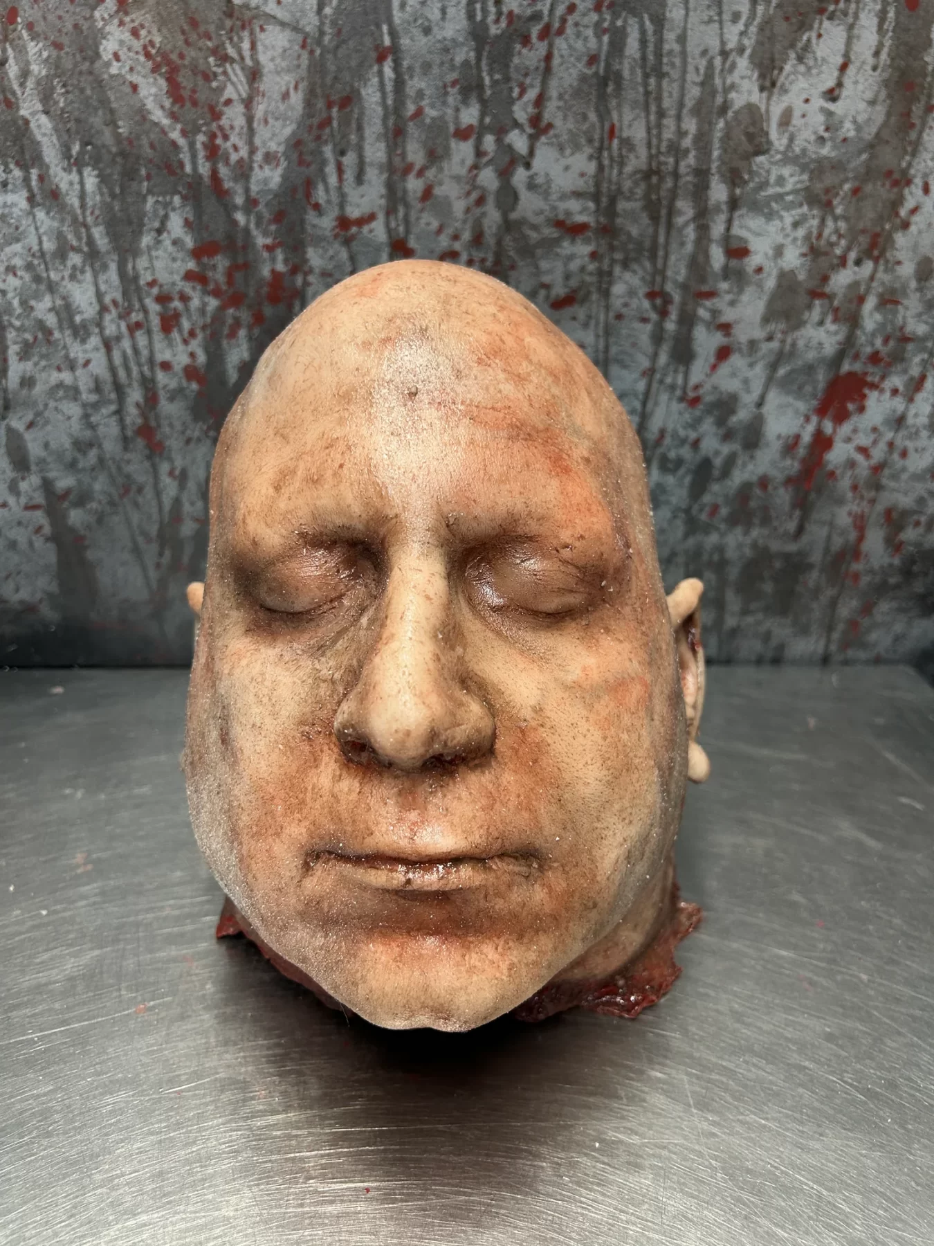 This severed head has a thick silicone skin and foam filled. Each one is individually made with unique skin tones, scarring, and blood splatter to ensure they are a “one of a kind.” Hand punched hair and other modifications are available at an additional cost. The price of these are based on the version in the pic. This is the perfect addition to your haunt, escape room, or collection of oddities.