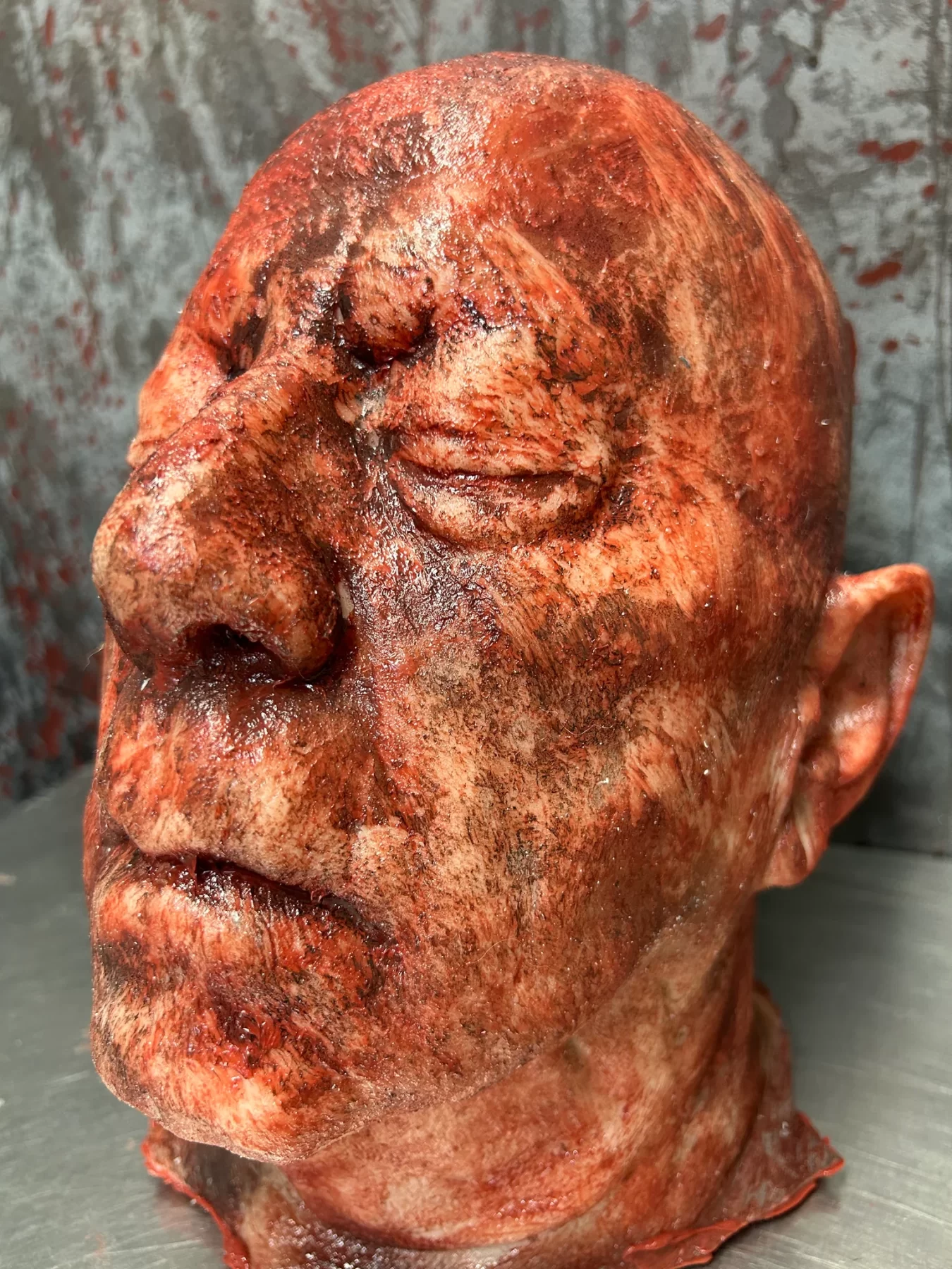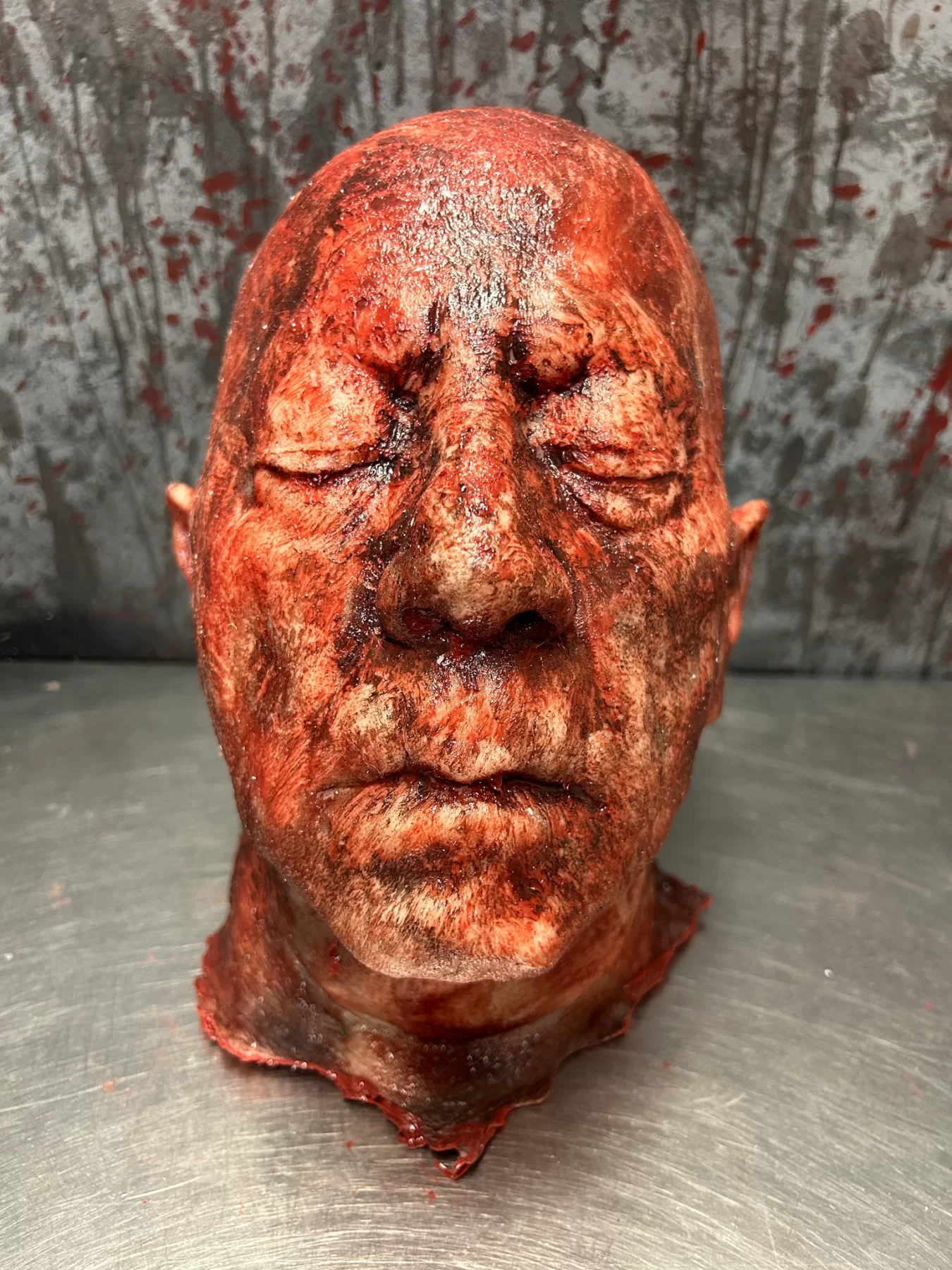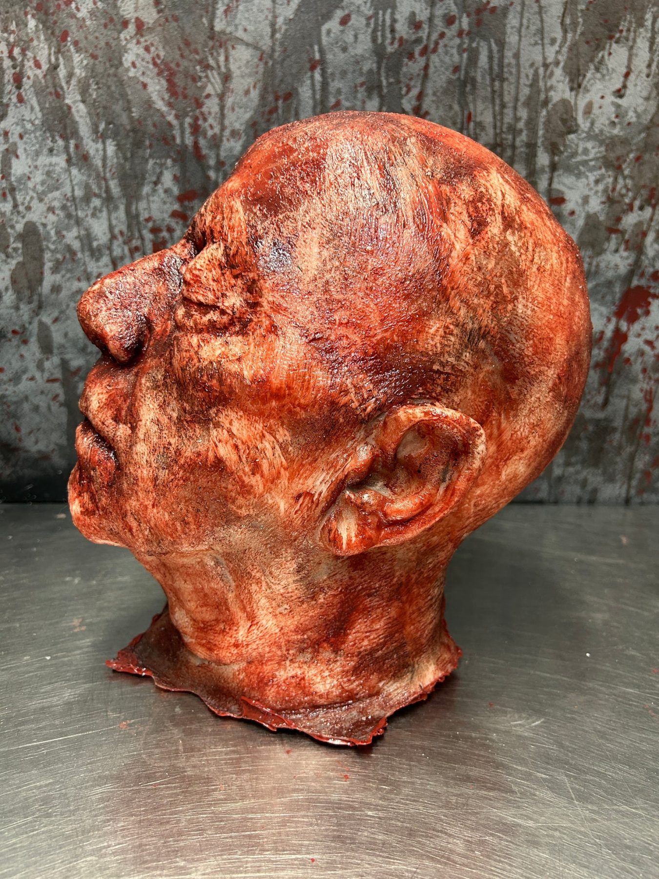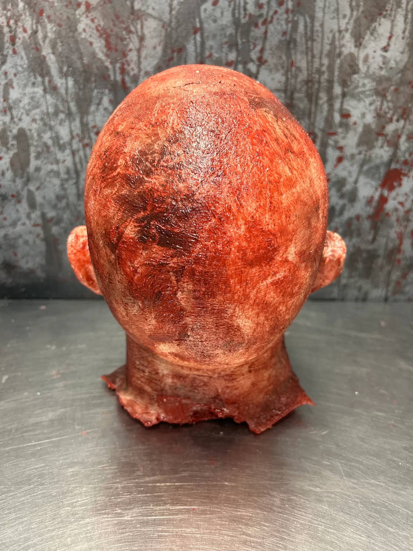 This severed head has a thick silicone skin and is foam filled. Each one is individually made with unique skin tones, scarring, and blood splatter to ensure they are a “one of a kind.” Hand punched hair and other modifications are available at an additional cost. The price of these are based on the version in the pic. This is the perfect addition to your haunt, escape room, or collection of oddities.