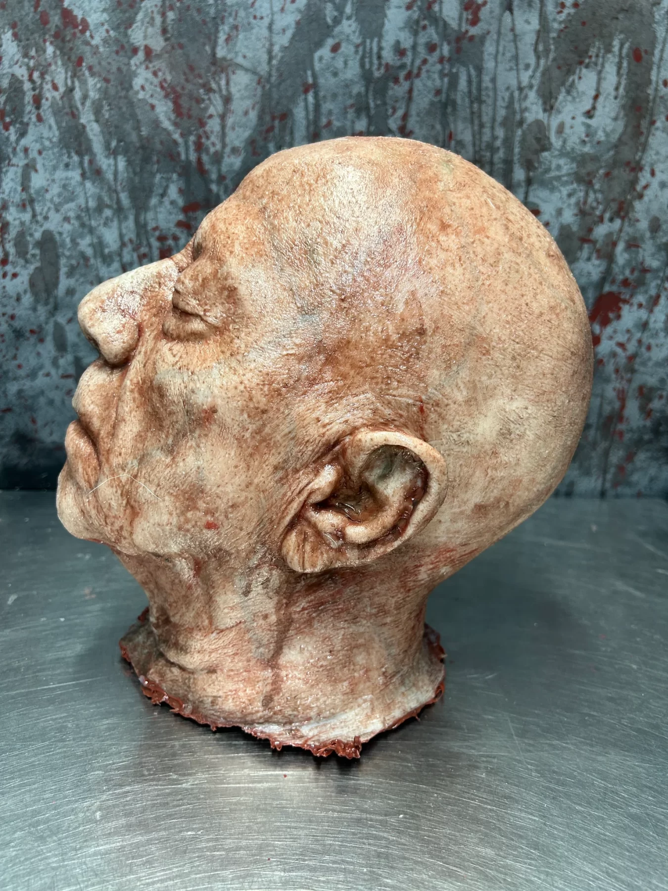 This severed head has a thick silicone skin and is foam filled. Each one is individually made with unique skin tones, scarring, and blood splatter to ensure they are all unique. Hand punched hair and other modifications are available at an additional cost. The price of these are based on the version in the pic. This is the perfect addition to your haunt, escape room, or collection of oddities.