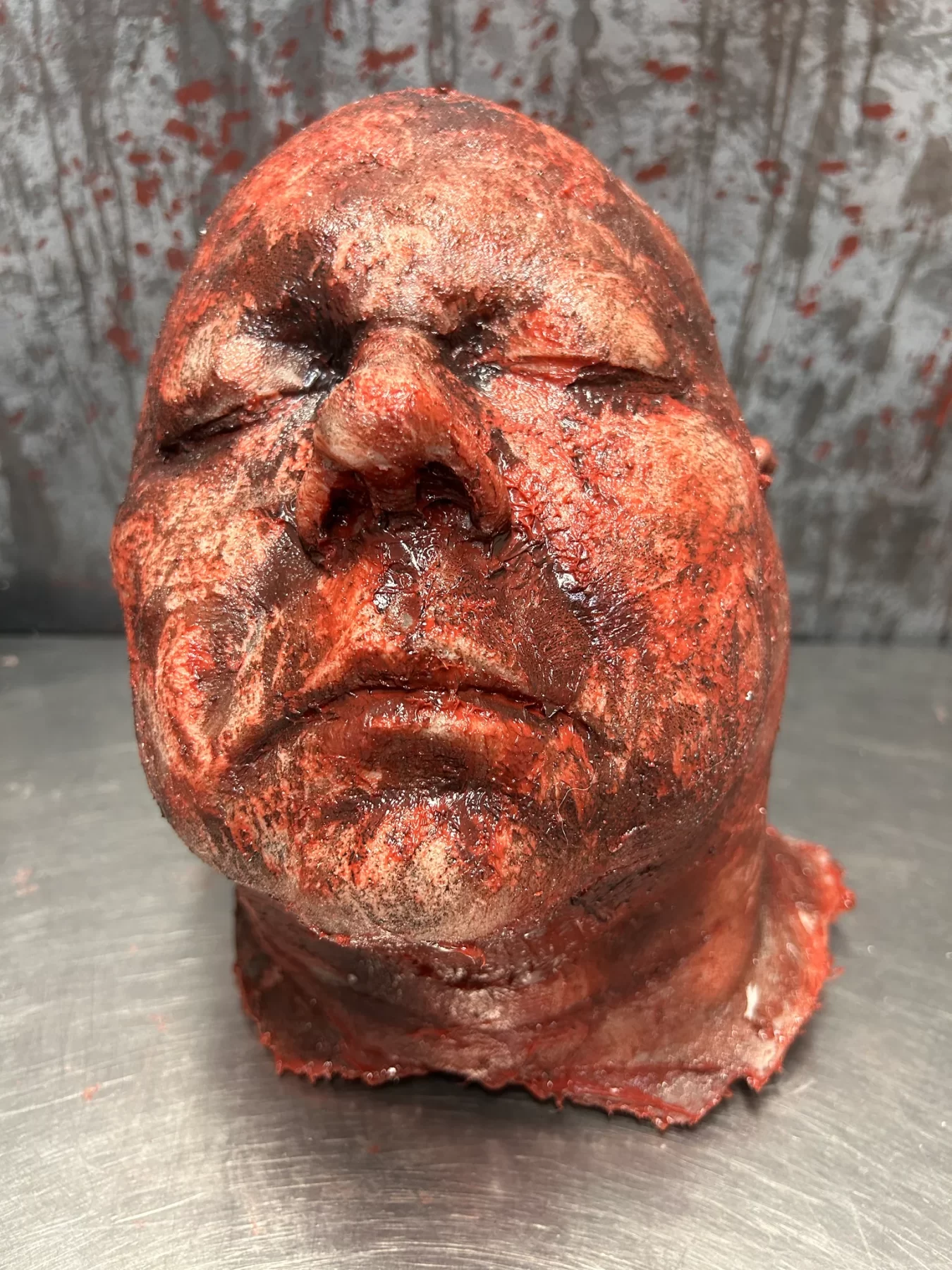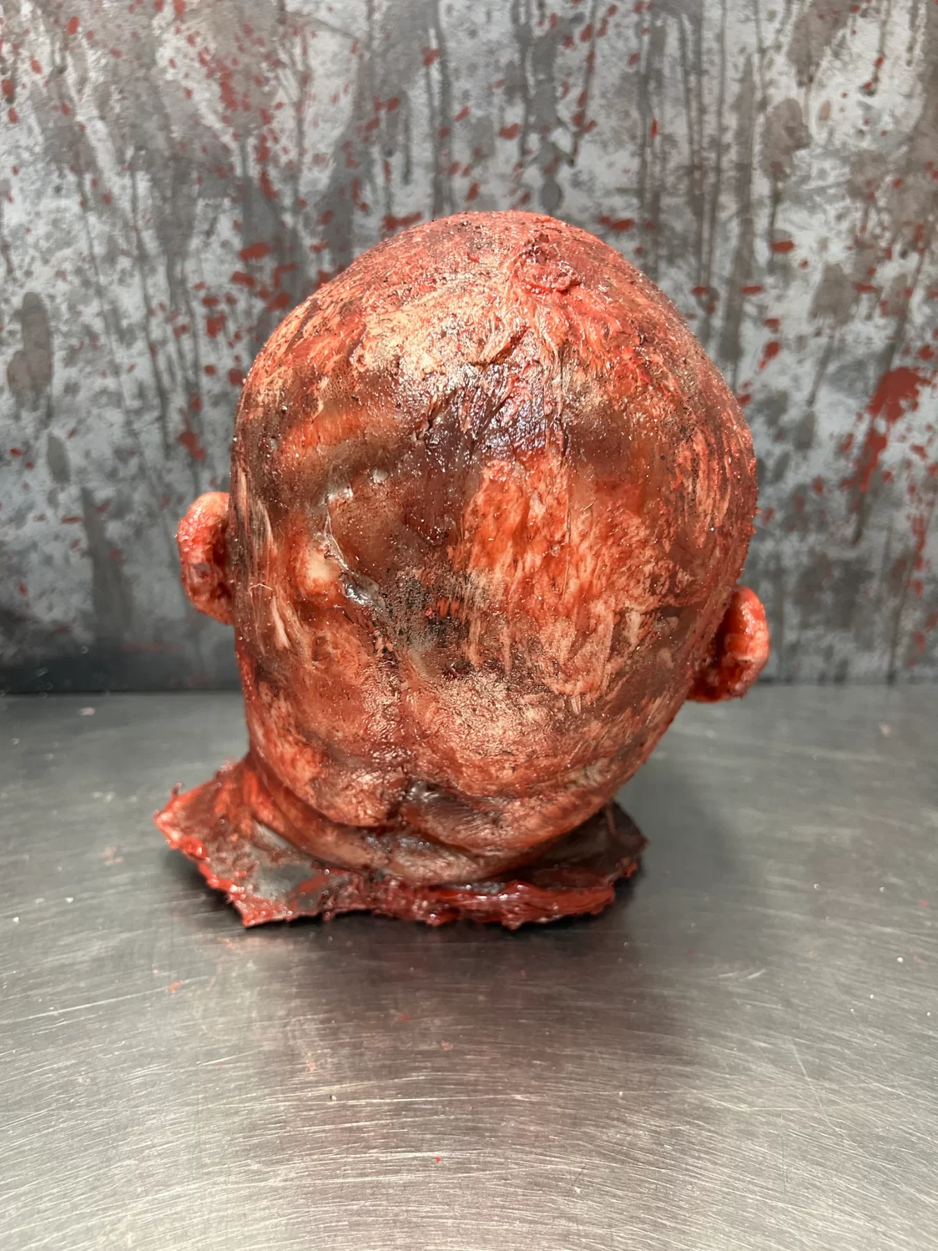 This severed head has a thick silicone skin and foam filled. Each one is individually made with unique skin tones, scarring, and blood splatter to ensure they are a “one of a kind.” Hand punched hair and other modifications are available at an additional cost. The price of these are based on the version in the pic. This is the perfect addition to your haunt, escape room, or collection of oddities.