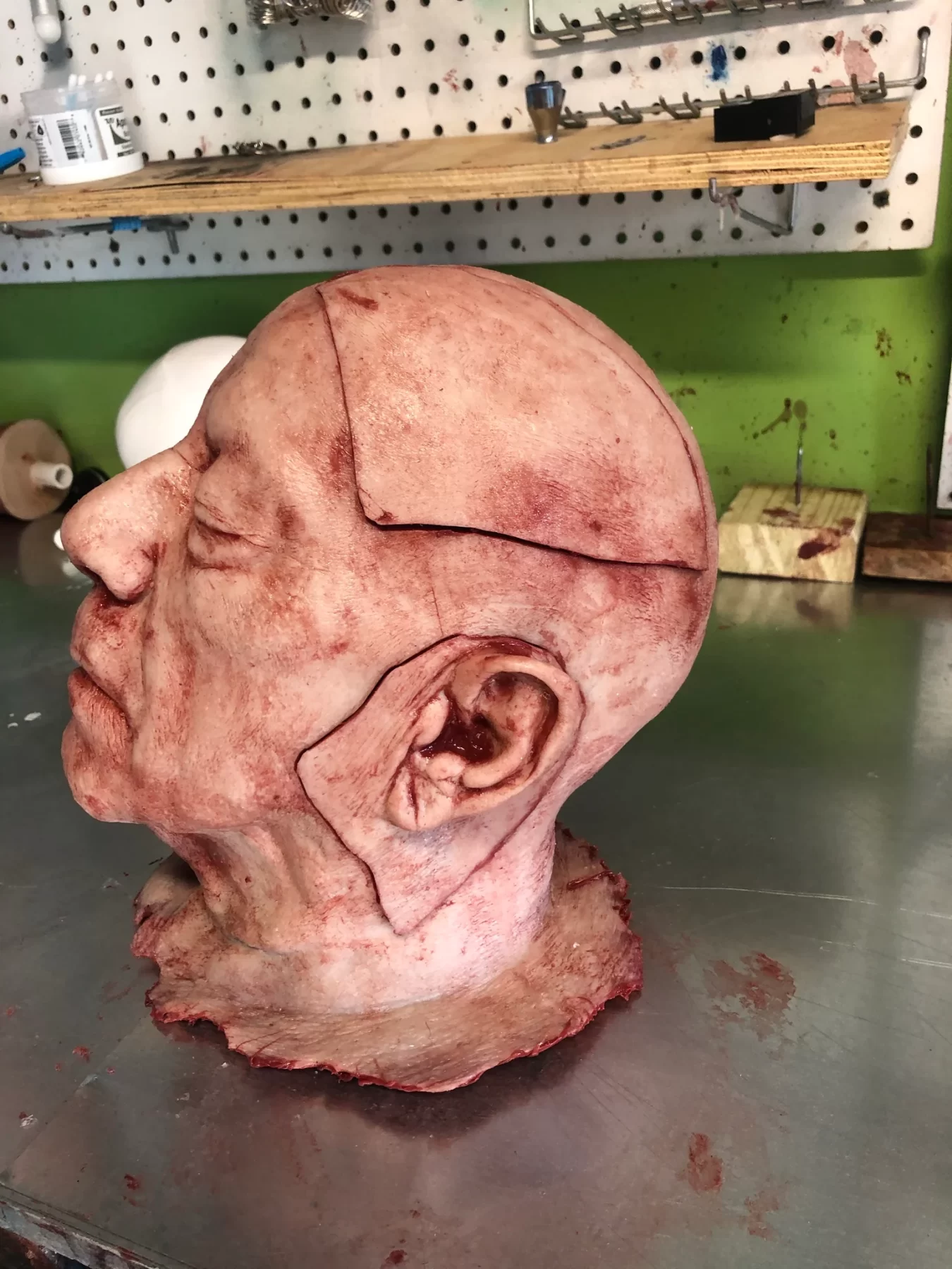 This severed head has four flaps of removable skin that are attached with strong magnets. The perfect addition to your escape room puzzles. Highly detailed and extremely durable this piece is skinned with silicone and has a foam core. Each piece is individually made so each one is unique. Add scarring, hair, or lettering carved into the skin to add your own flare.