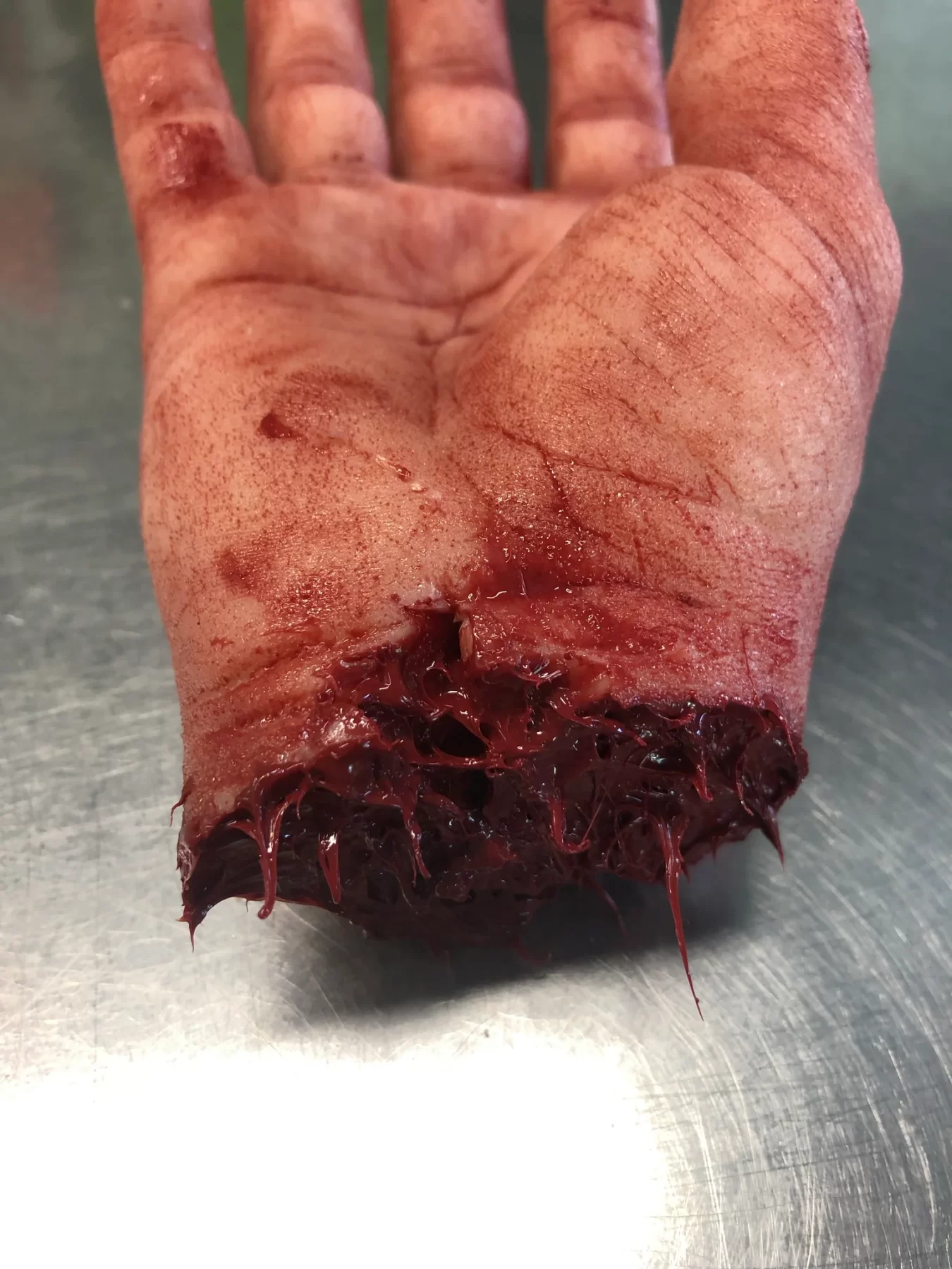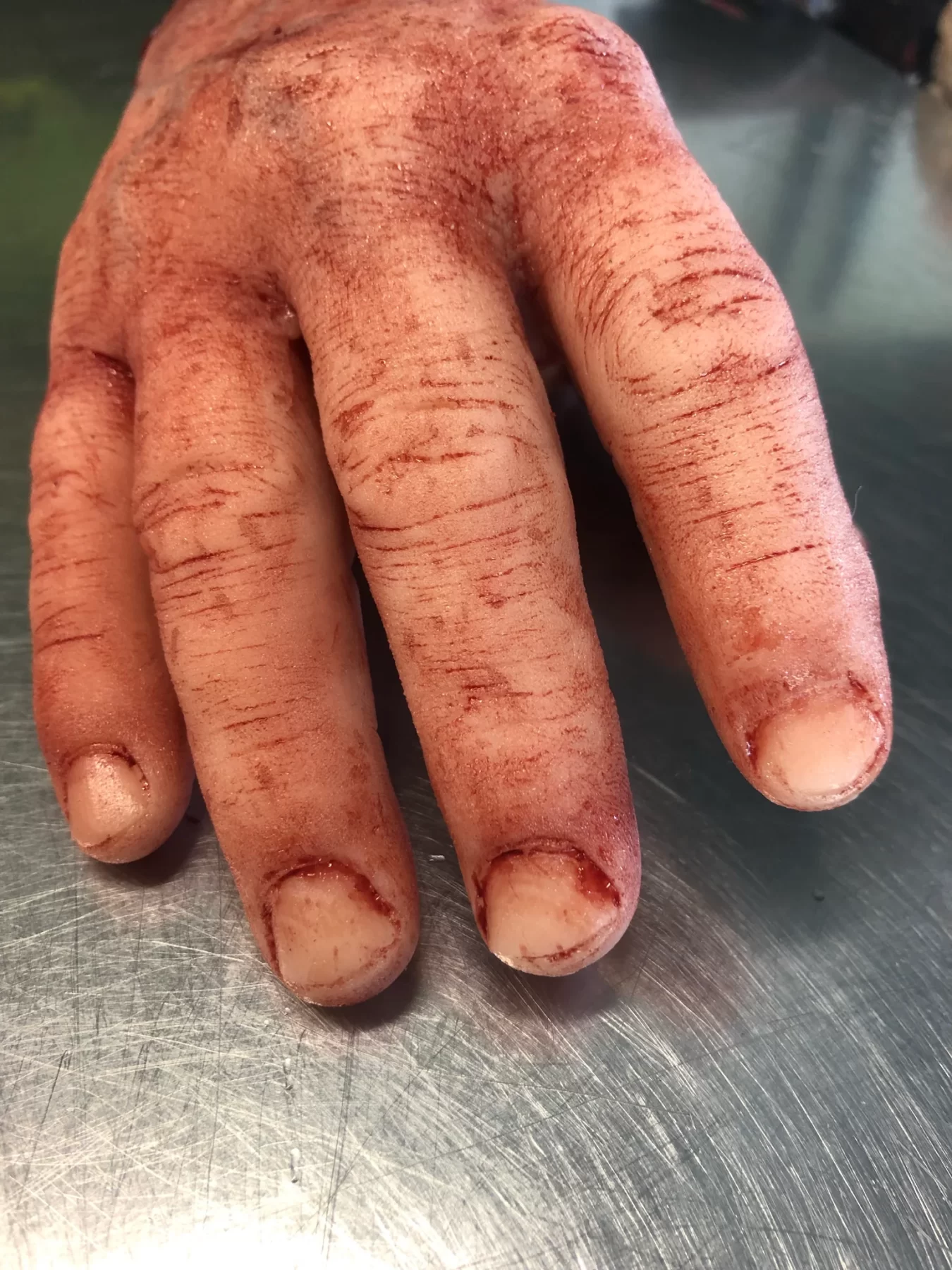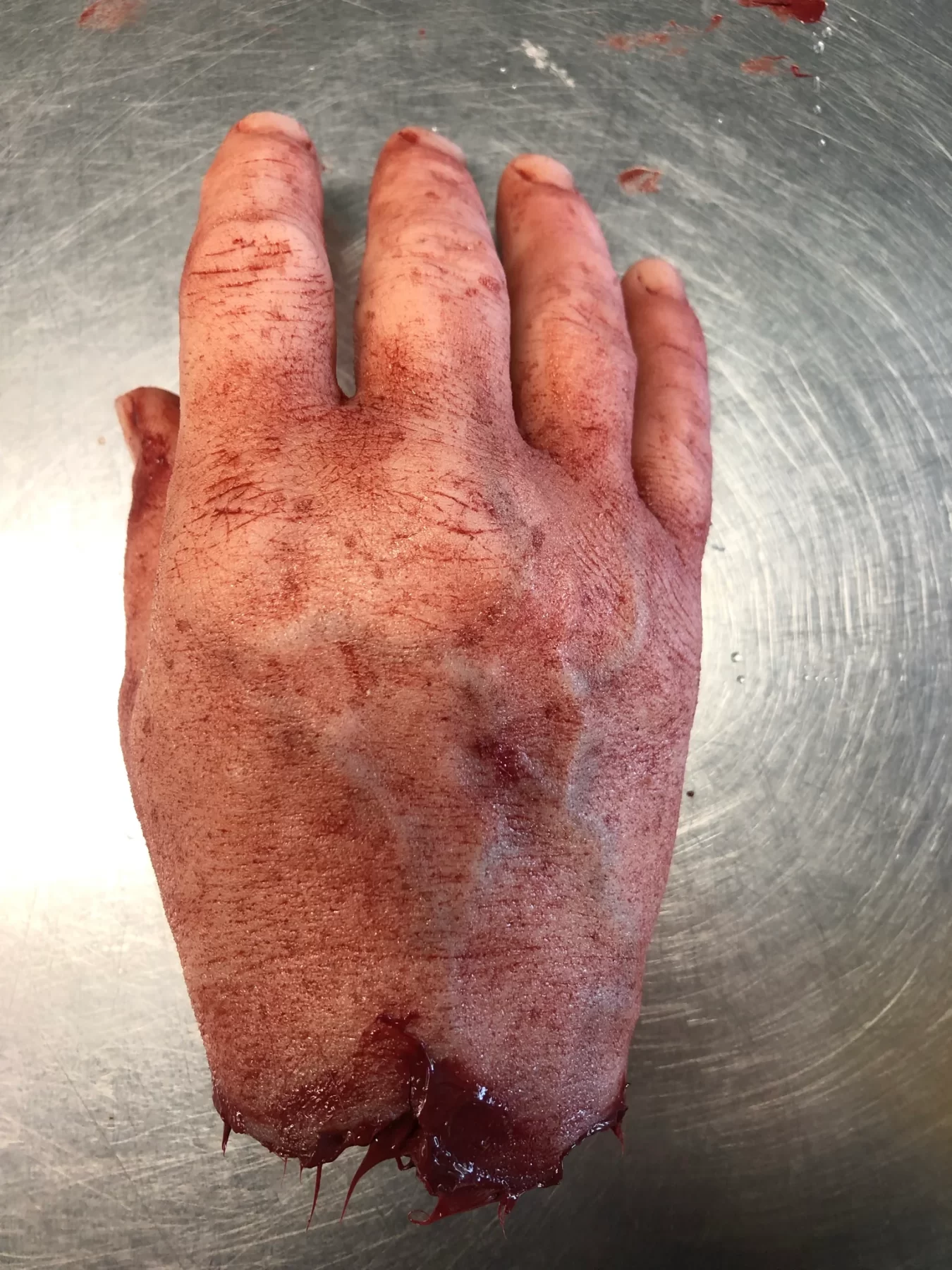 Severed male right hand made of silicone. Left hand is also available. Highly detailed and film ready. This prop is the perfect addition to any Haunt, Halloween display, or collection of oddities. Individually painted and scarred each one is unique.