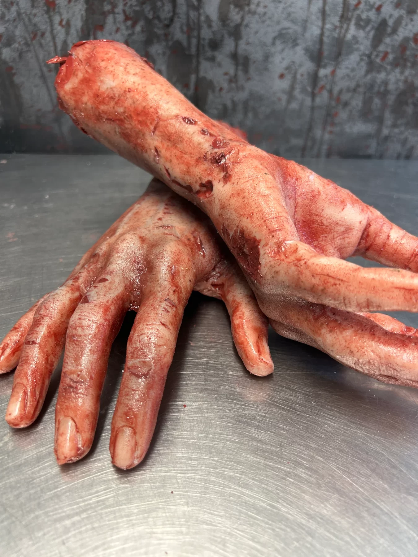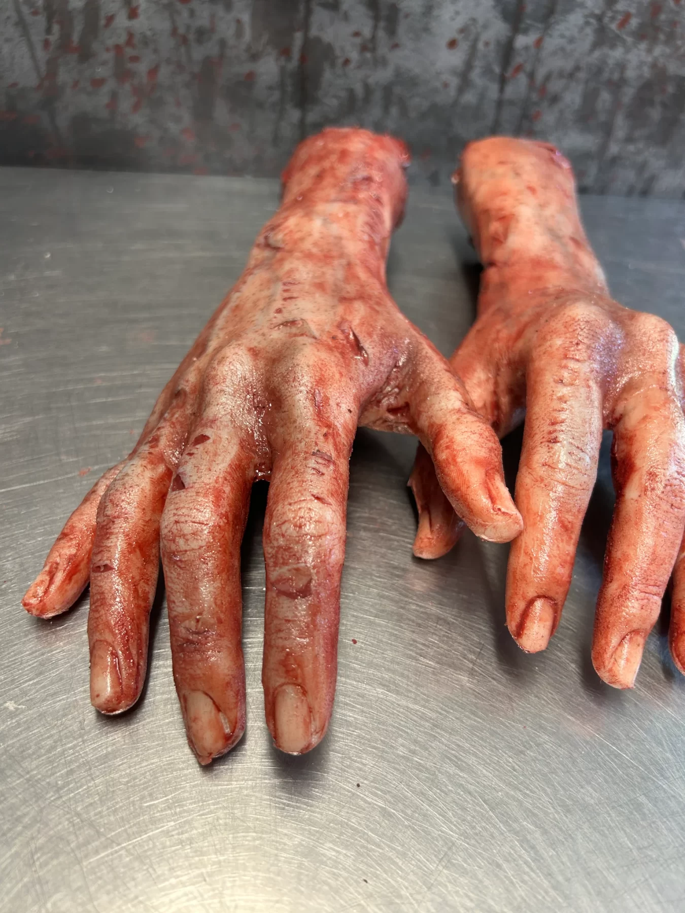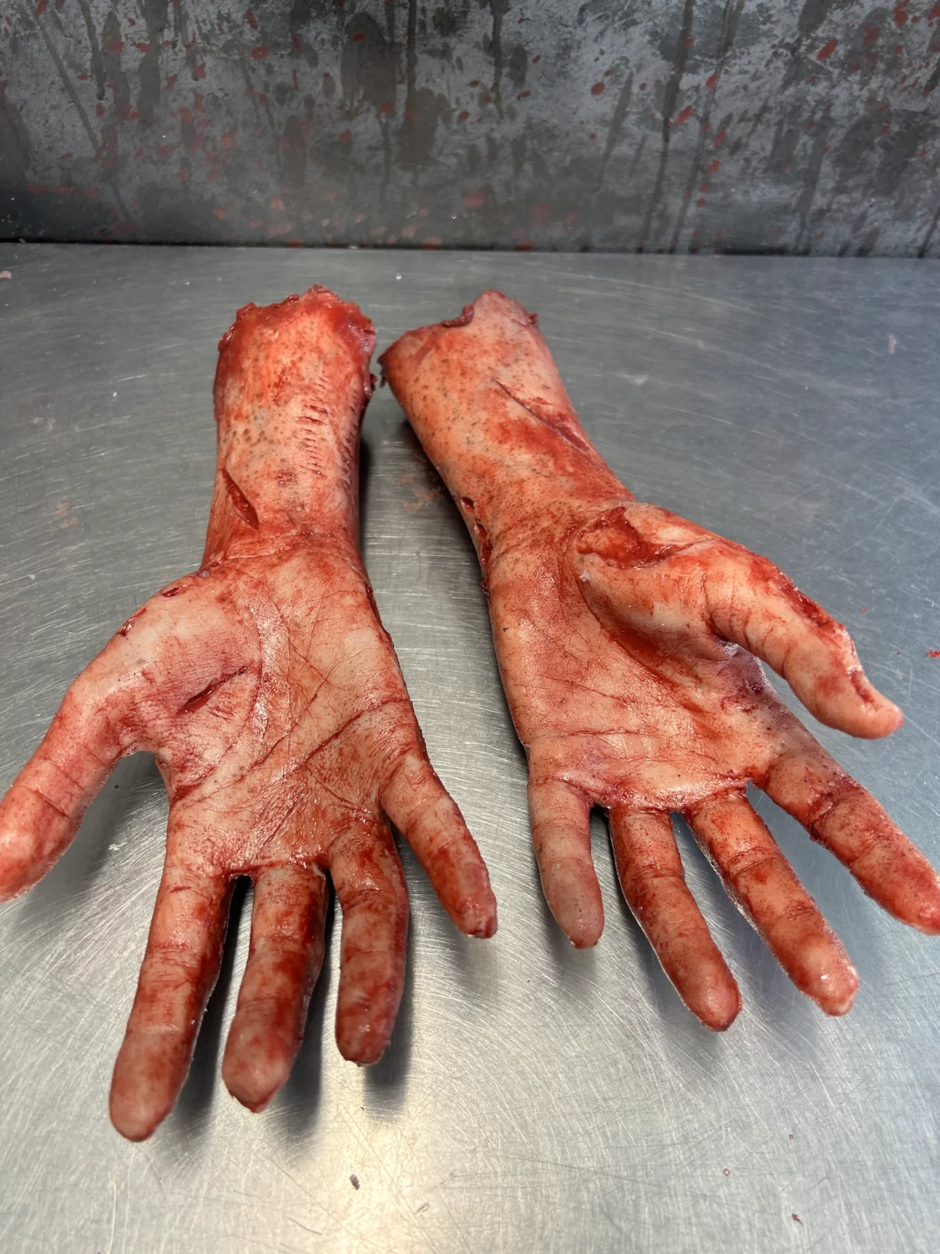 This is a pair of severed zombie arms made of silicone. The hands are solid silicone, and the arm has a foam core. These highly detailed arms are the perfect addition to your haunt or film set. These are made to order so no two pairs are alike.
